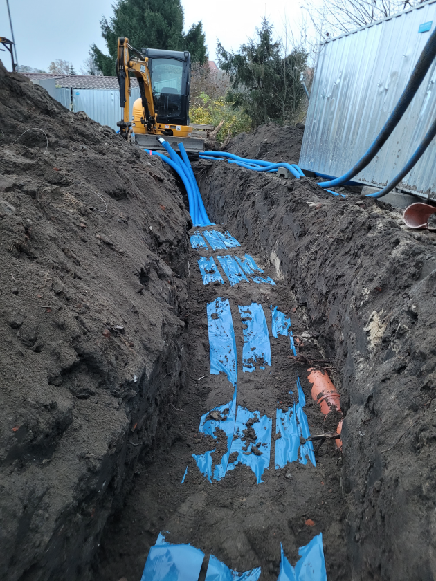 Ułożono podziemne kable zewnętrzne pomiędzy rozdzielnią elektryczną Ob. 9 a dwoma punktami narożnymi działki wzdłuż linii brzegowej jeziora.